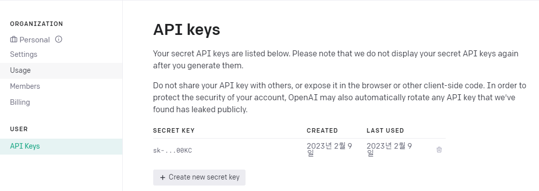 * API 키가 생성되면 이를 복사하여 코드에서 사용하여 OpenAI API로 인증할 수 있습니다.